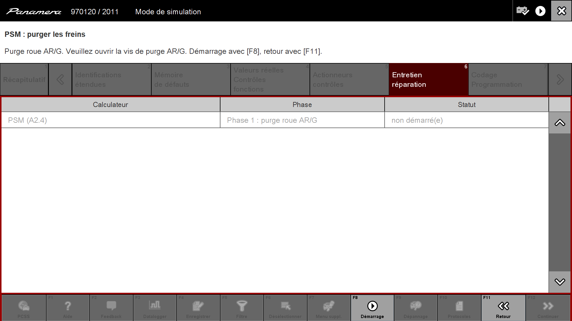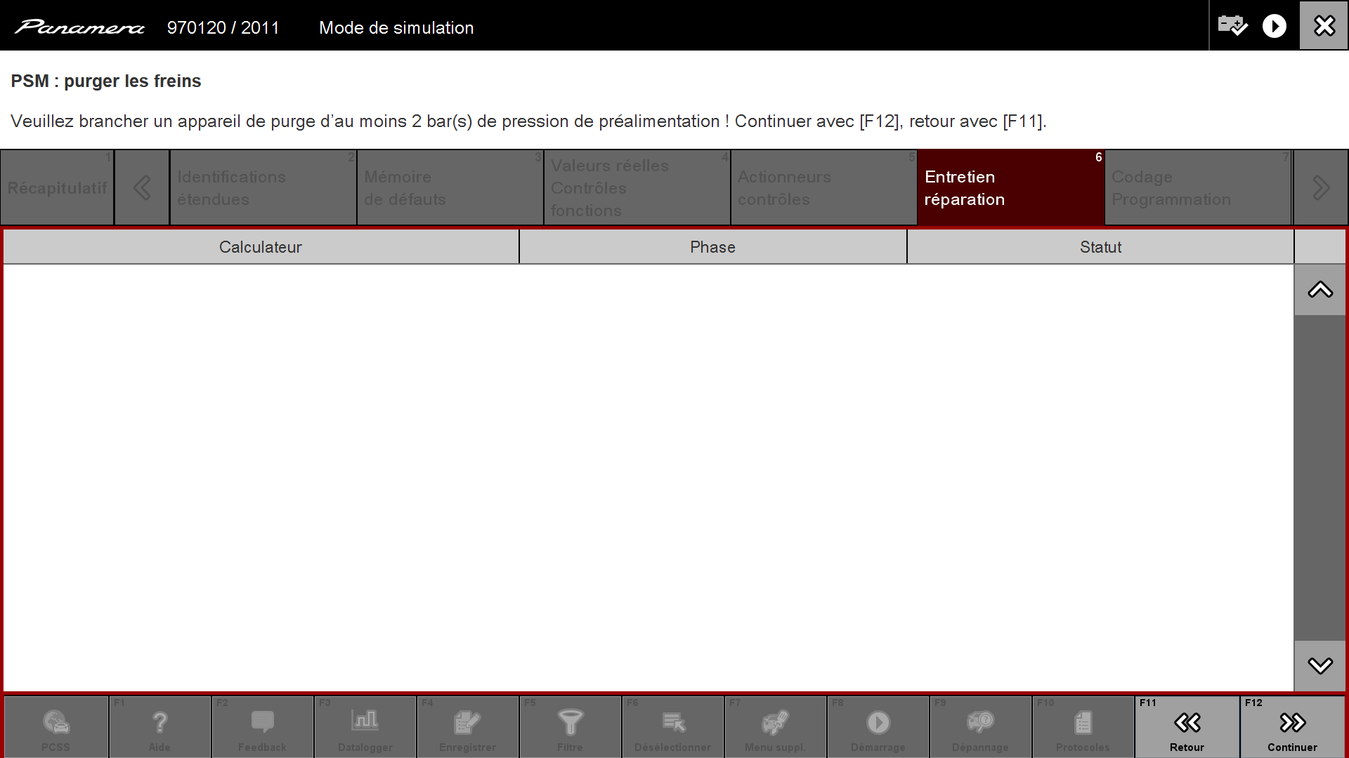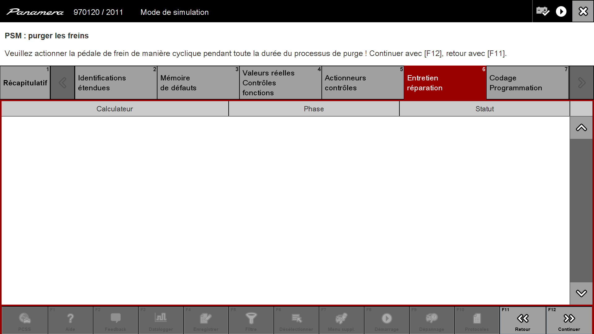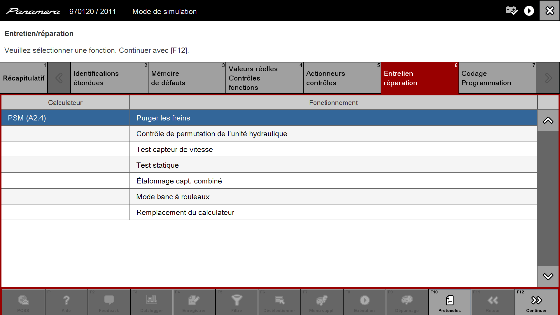 Puis sur la fenêtre suivant on clique sur "Purger les freins" et on valide en cliquant sur la touche en bas "Continuer" ou F12 :